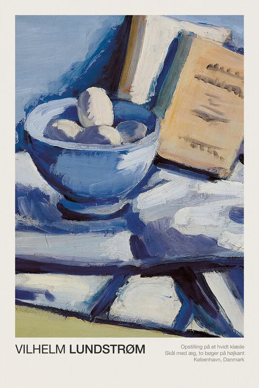 Stenska nalepka Still Life with a white cloth, Bowl of eggs and two books (Abstract Kitchen) - Vilhelm Lundstrøm
