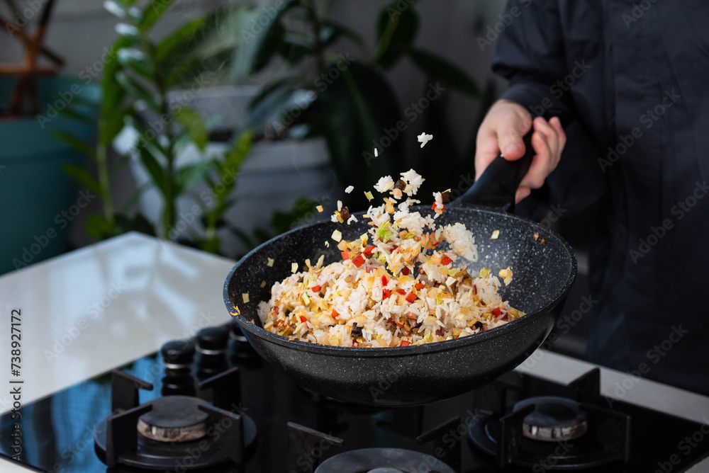 Slika na platnu Close up of Chef cook hands cooking and toss roasted vegetables with rice for Asian cuisine in frying wok pan on gas stove