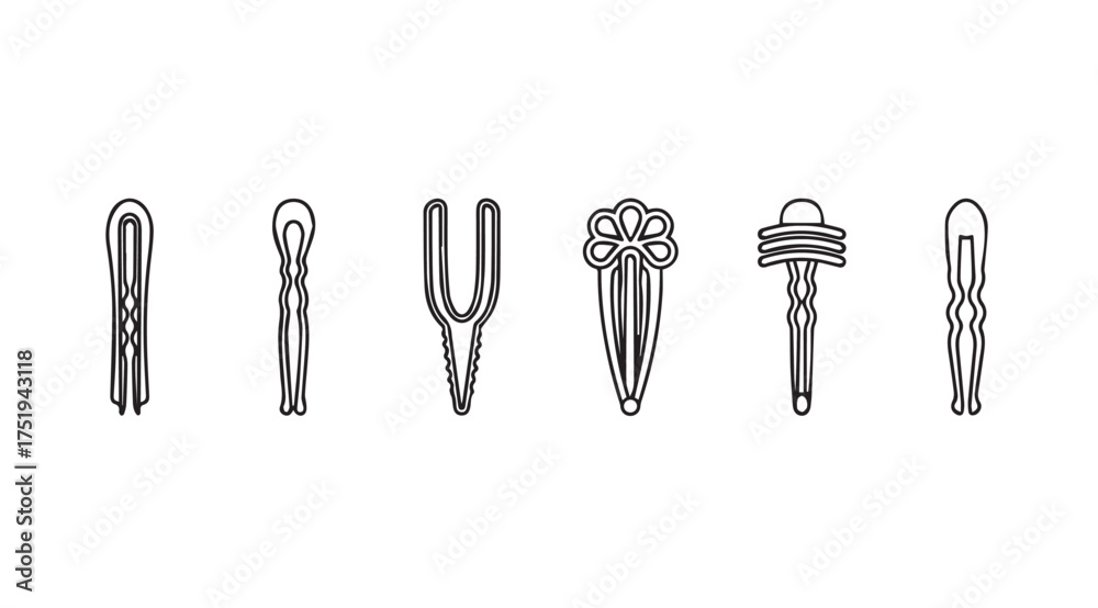 Slika na platnu Collection of six distinct hairpins and hair clips in a clean and simple line ar
