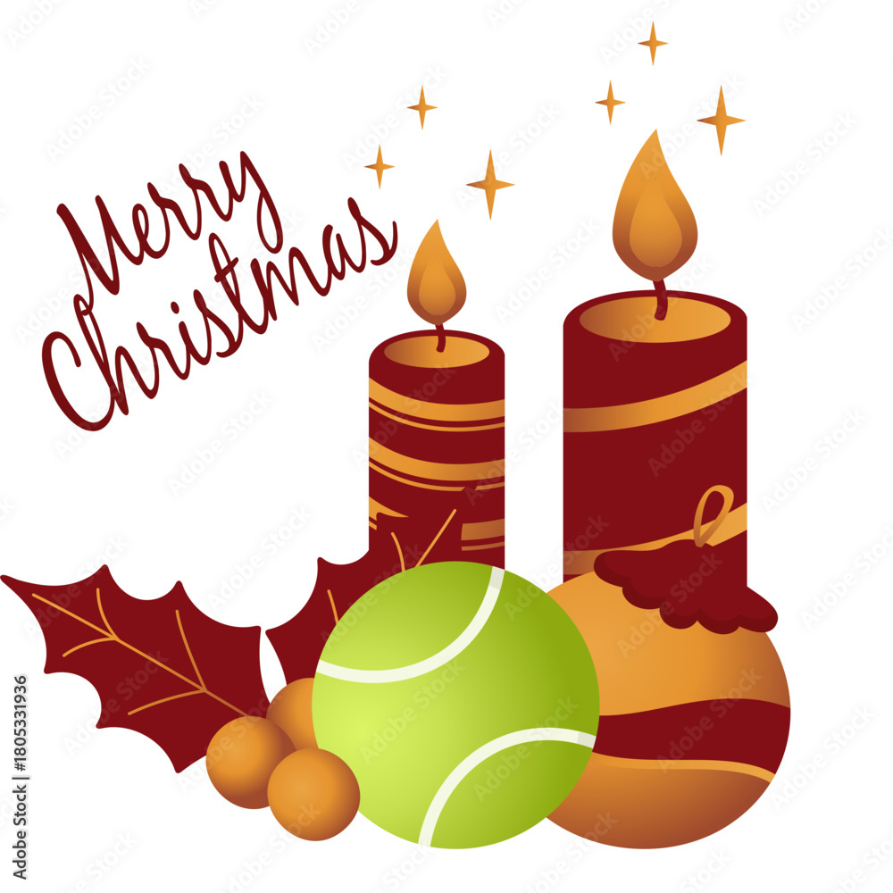 Fototapeta Festive Christmas tennis illustration featuring holly, candles, bells, evergreen branches, and warm seasonal details
