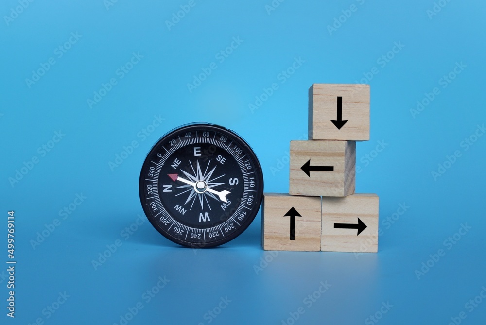 Fototapeta Compass and wooden cubes with arrow on blue background