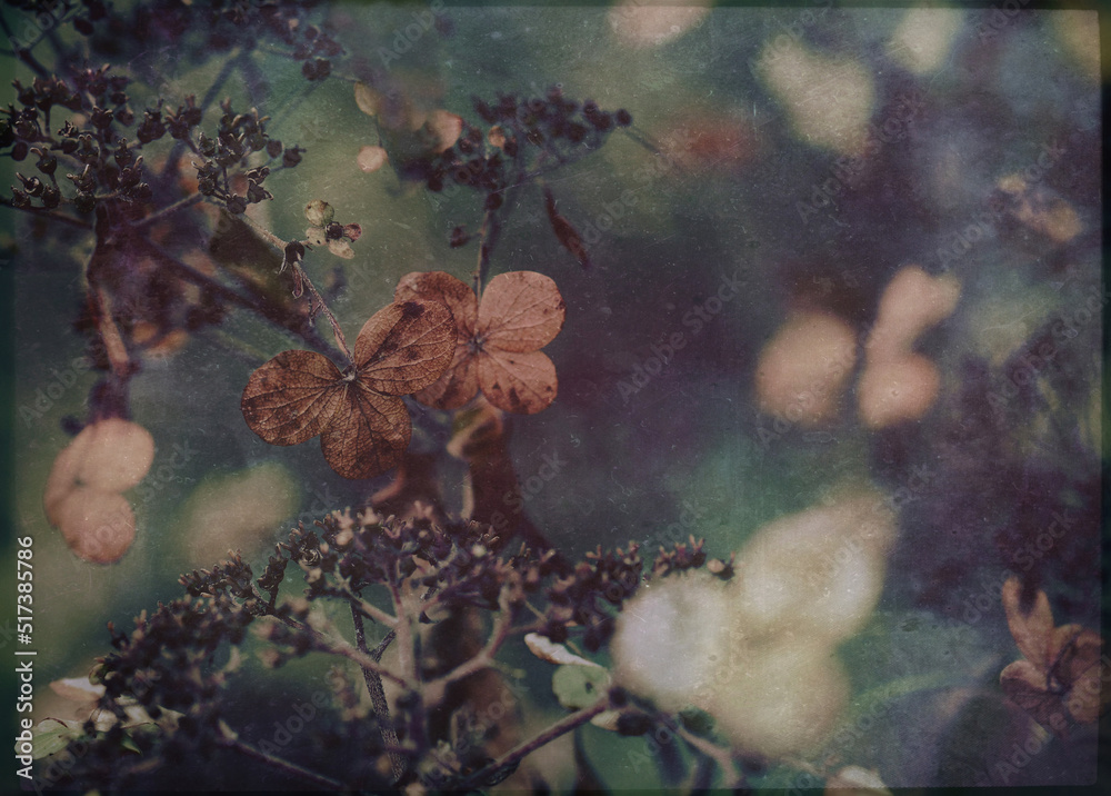 Fototapeta Vintage grunge textured dark botanical moody nature background of dead dried hyd