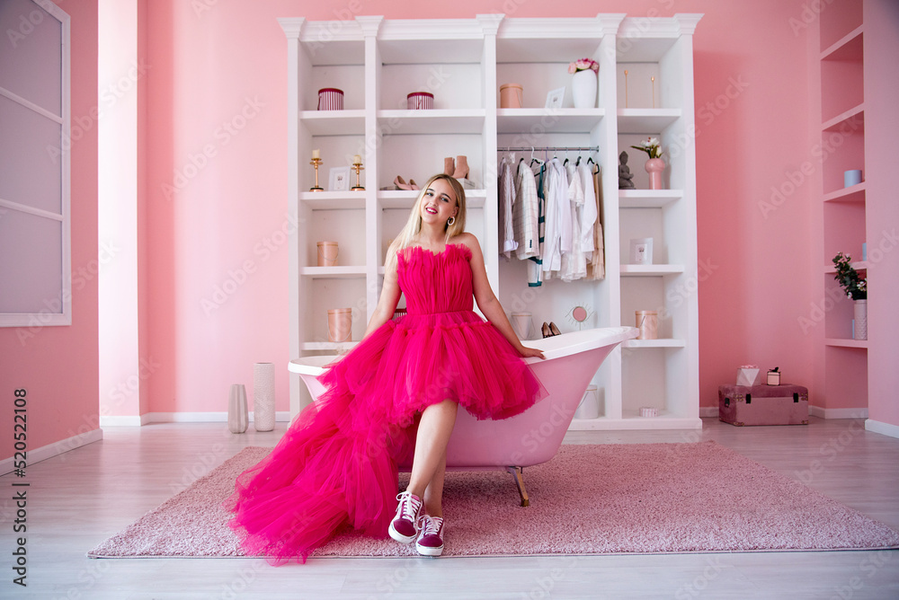 Fototapeta blond happy girl in pink dress and sneakers sitting in pink boudoir with bath i
