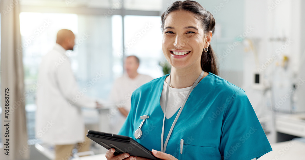 Fotografija Happy, face and woman with a tablet, doctor and typing with connection, website info and employee