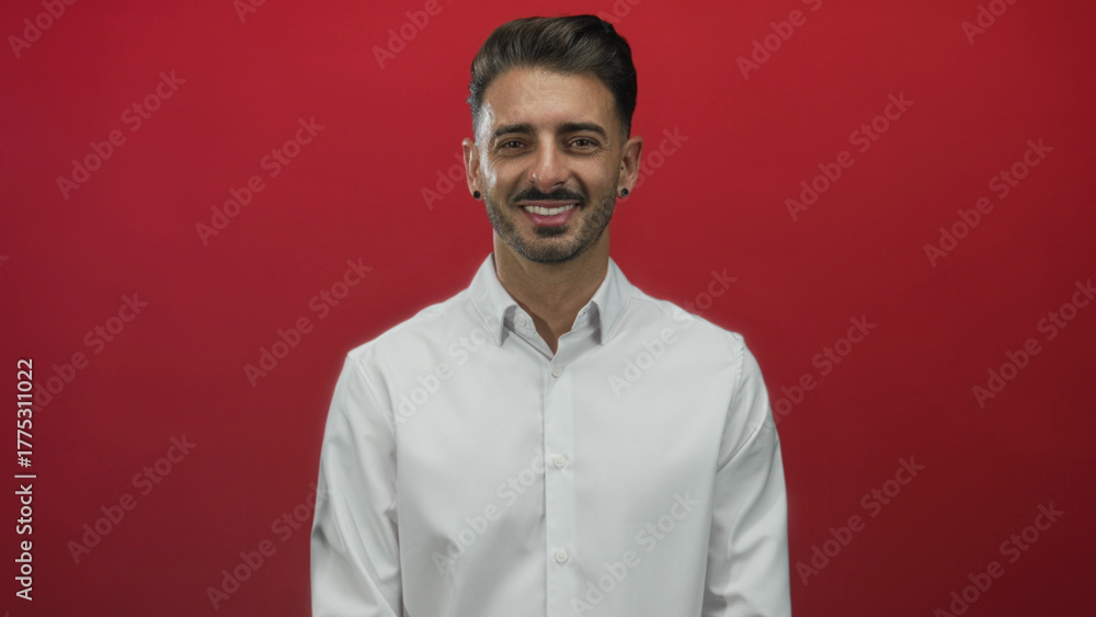 Slika na platnu Hispanic man face winking with toothy smile and confident gaze wearing white shirt in red studio; playful charm cheerful