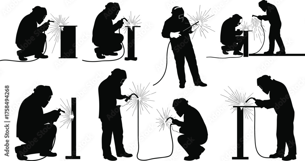 Fotografija Industrial welder silhouettes working with sparks and metal equipment, factory w