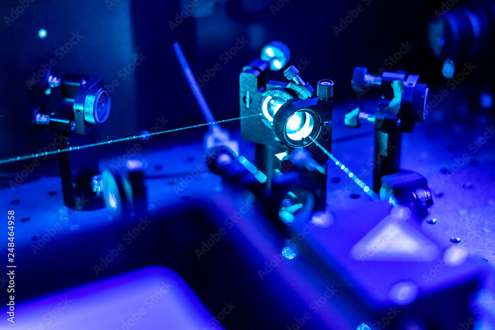 Fotografija laser reflect on optic table un quantum laboratory b