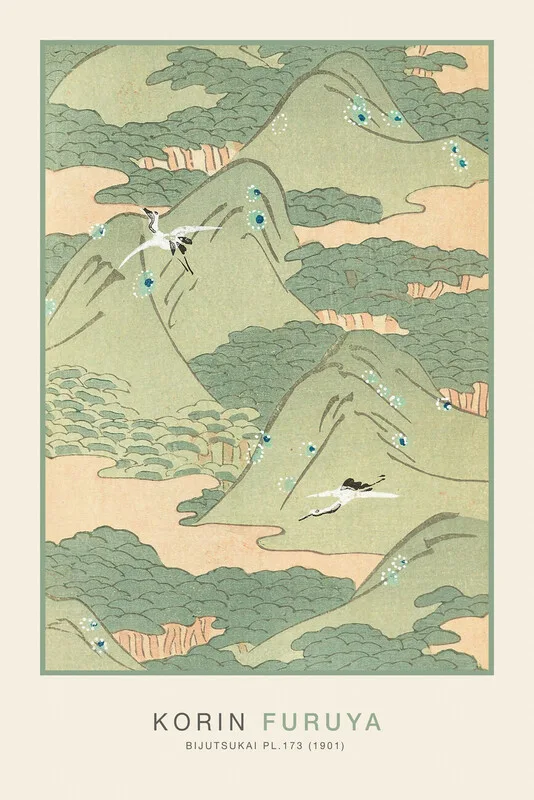 Stenska nalepka Cranes & Mountains in Pastel Green (Japandi) - Furuya Kōrin