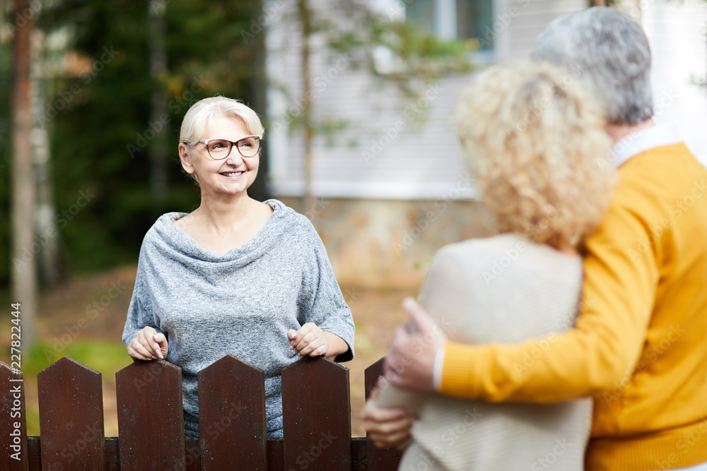 Stenska nalepka Blonde mature woman in eyeglasses and grey pullover looking at her neighbours du