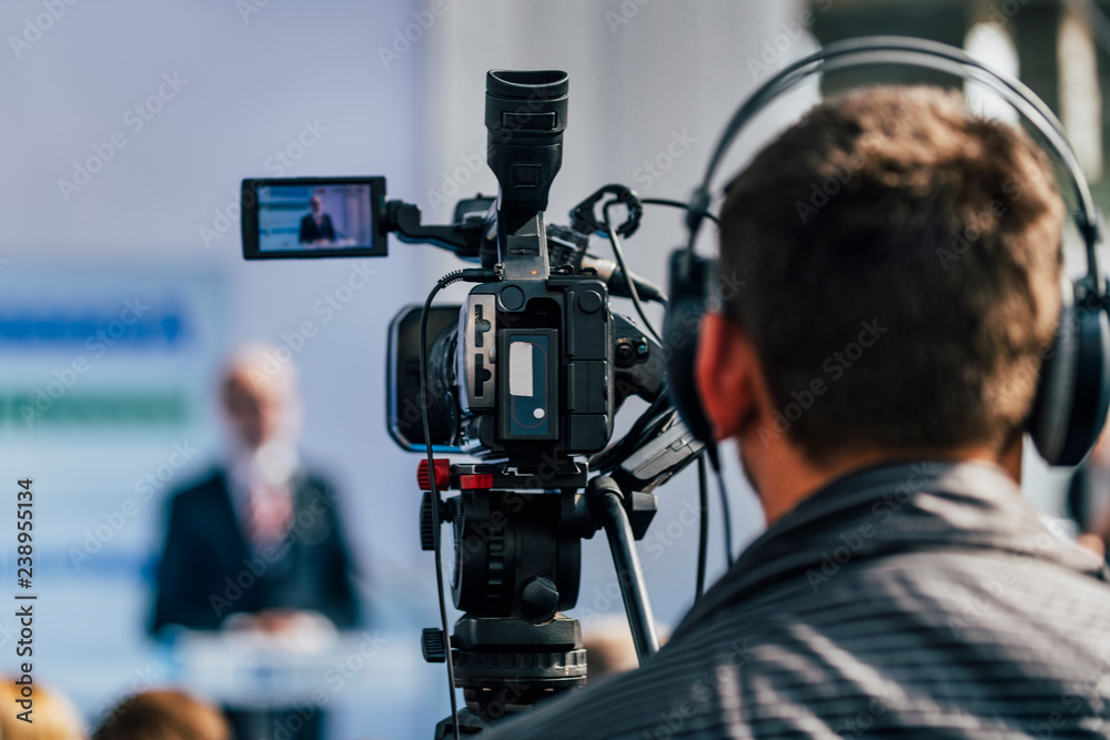 Stenska nalepka Press Conference Event. Cameraman Recording Male Speaker