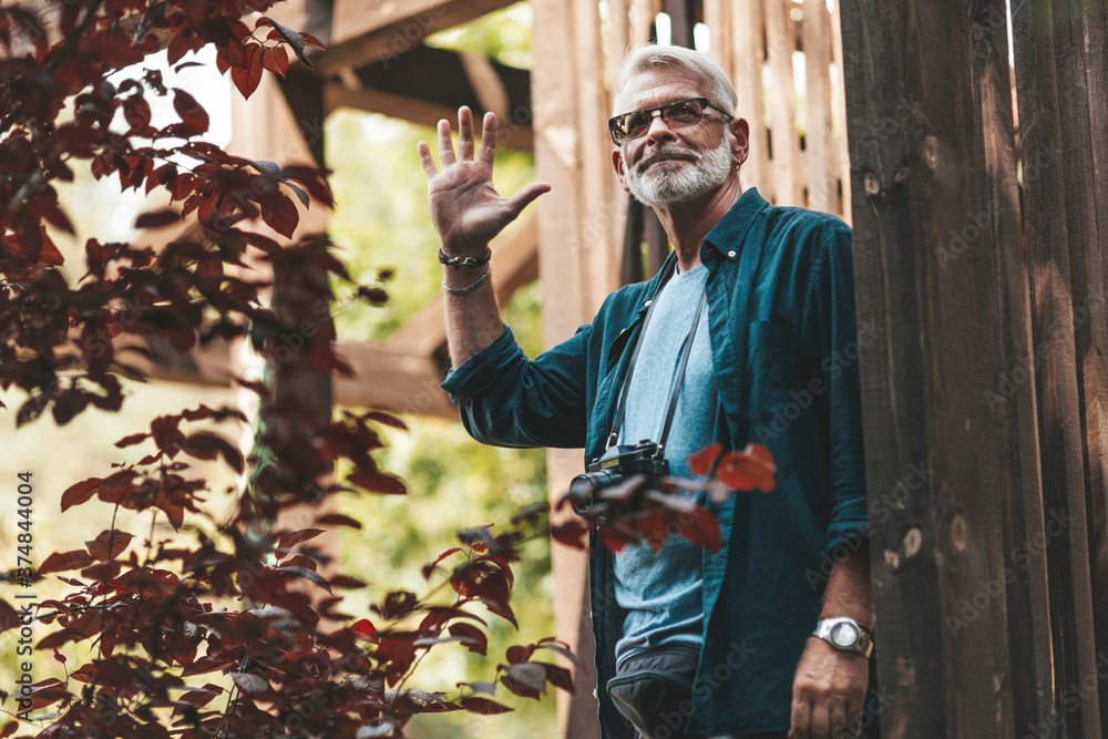 Stenska nalepka Retired neighbor with a beard greets and smiles on the terrace of the house