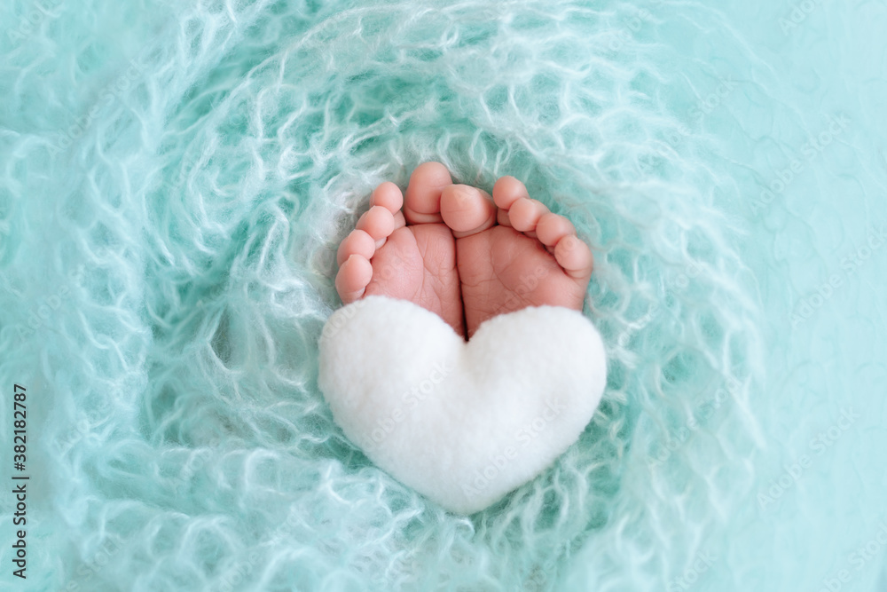 Stenska nalepka legs newborn baby close up on a blue background with a toy in the form of a hear