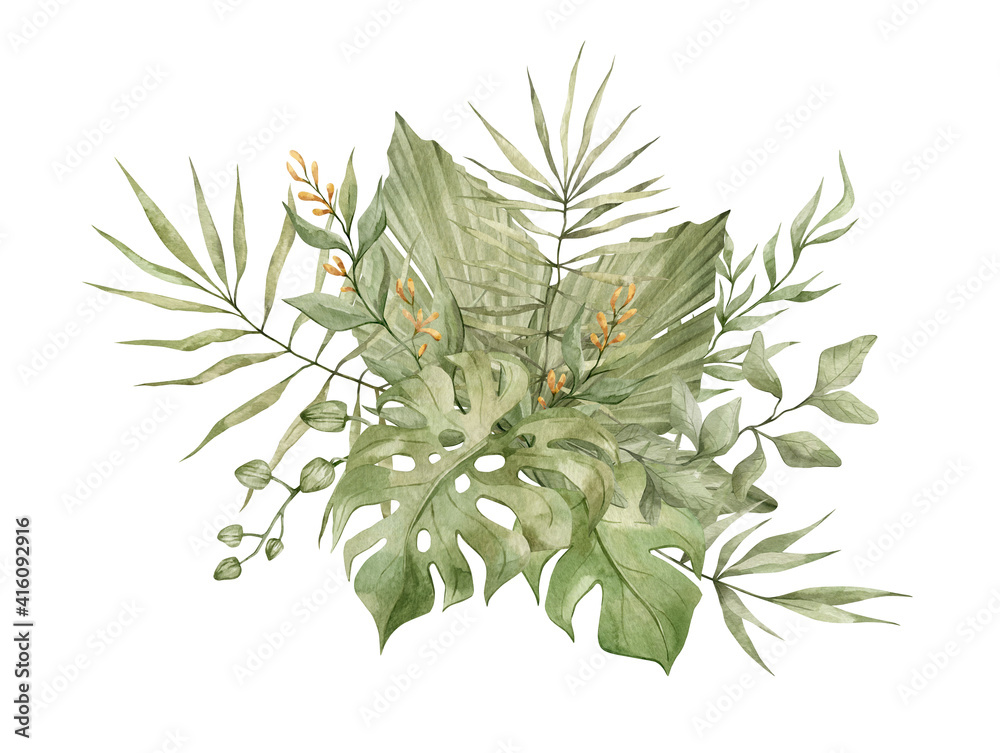 Stenska nalepka Watercolor bouquet with bright tropical leaves and flowers