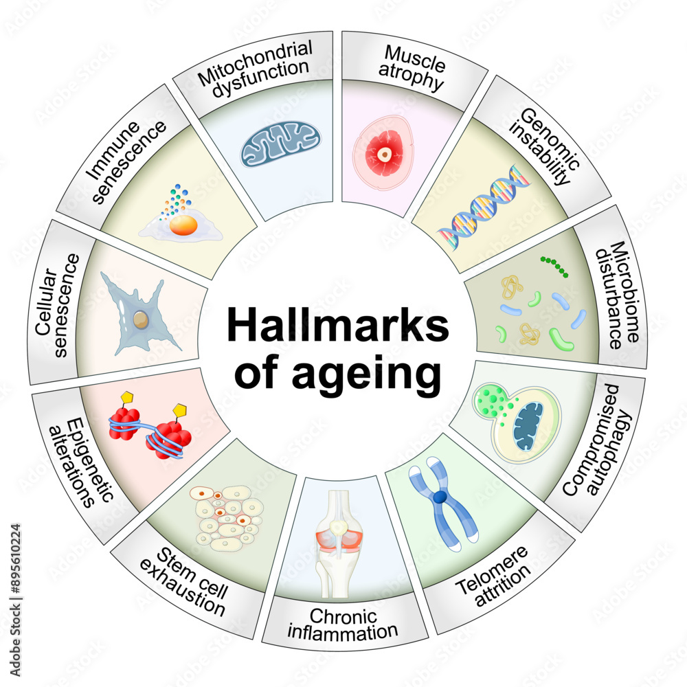 Stenska nalepka Hallmarks of ageing. Cellular senescence. Anti-aging therapy