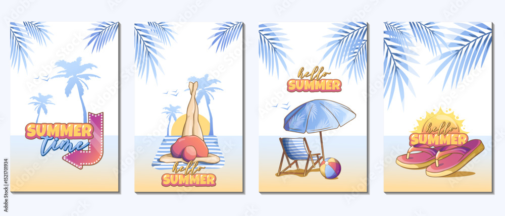 Slika na platnu set of summer holiday banners in blue tones, with handwritten text, a drawn gir