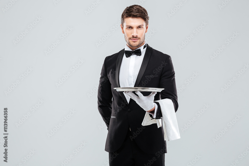 Fotografija Handsome yong waiter in tuxedo and gloves holding empty tray