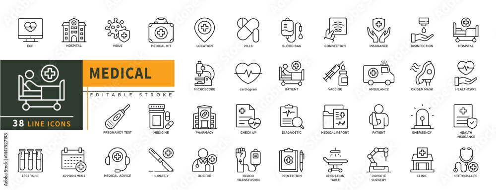 Fotografija Minimalist Medical line icons set with editable stroke, featuring hospital, virus, cardiogram, pills, blood bag, patient, check up, diagnostic, oxigen mask, doctor, ecf