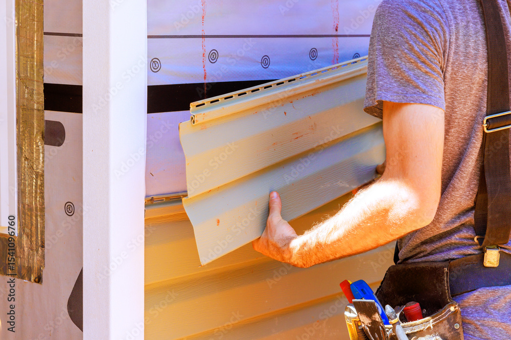 Fotografija Construction worker installs siding on house during sunny afternoon in residenti