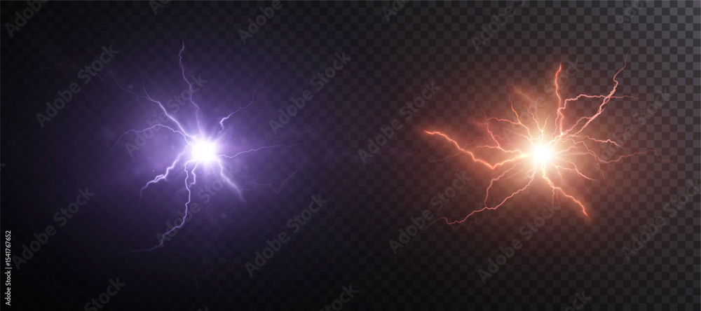 Fotografija Bright flashes of energy with branched lightning - purple and orange glow