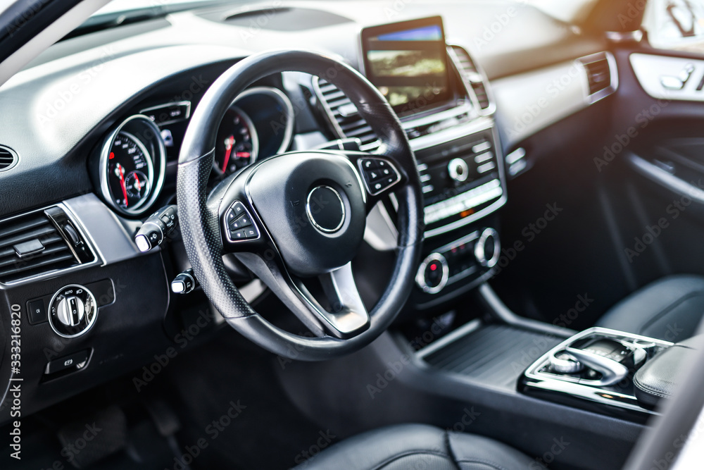 Fotografija Interior view of car, Luxury car steering wheel and clean dashboard with display or monitor screen