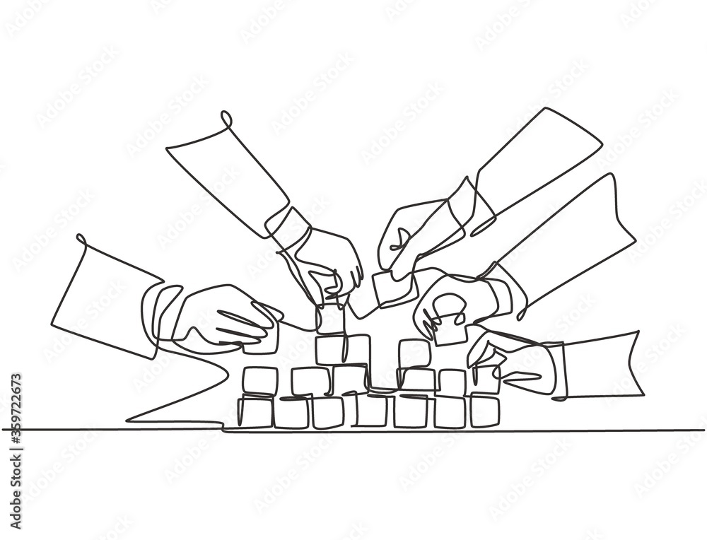 Fotografija Single continuous line drawing of business team member arrange wooden cube block become sturdy tower together to improve team building