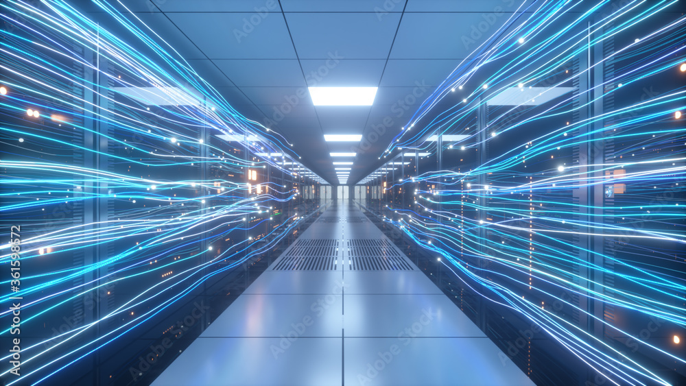 Fotografija Digital information flows through the network and data servers behind glass panels in the server room of a data center or Internet service provider