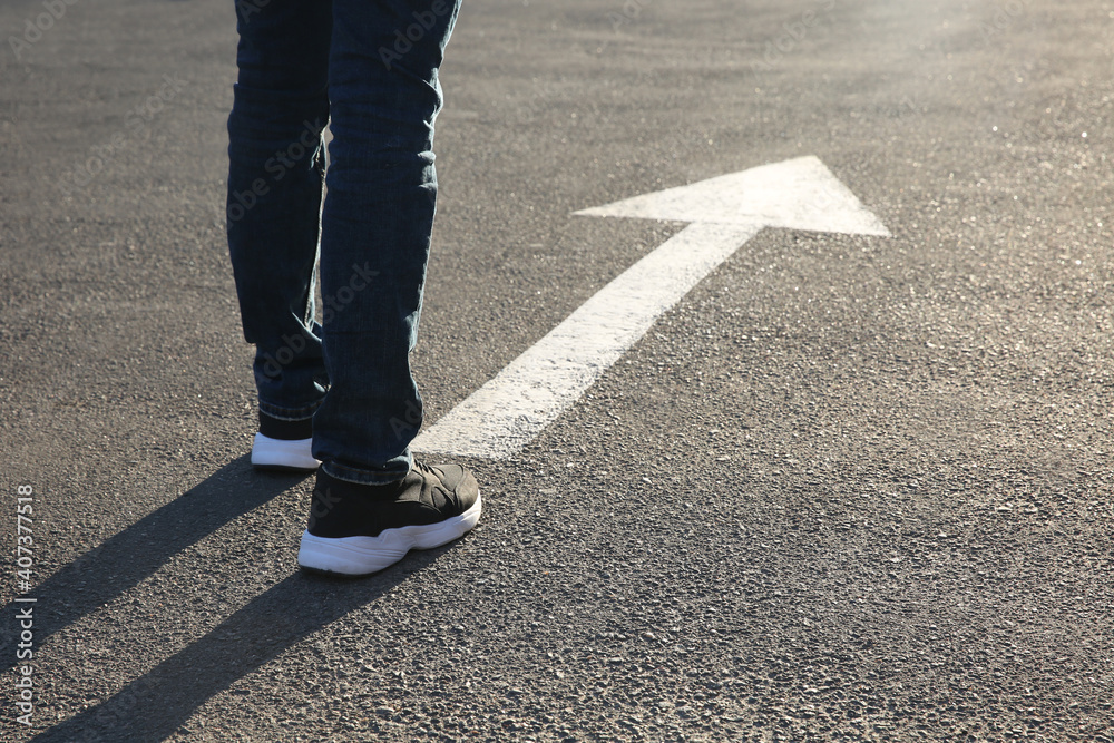 Fotografija Man going along road with arrow marking, closeup