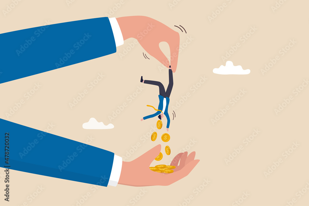 Fotografija Tax hike, government increase tax or steal money from people, debt or loan interest to pay off, unethical people overcharge bills, greed businessman hold small people shaking to get all their money