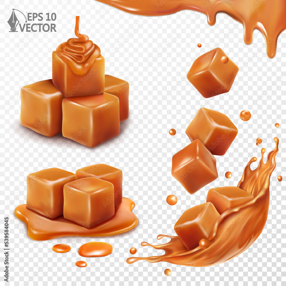 Fotografija 3D realistic vector set of a caramel pieces falling into a crown splash