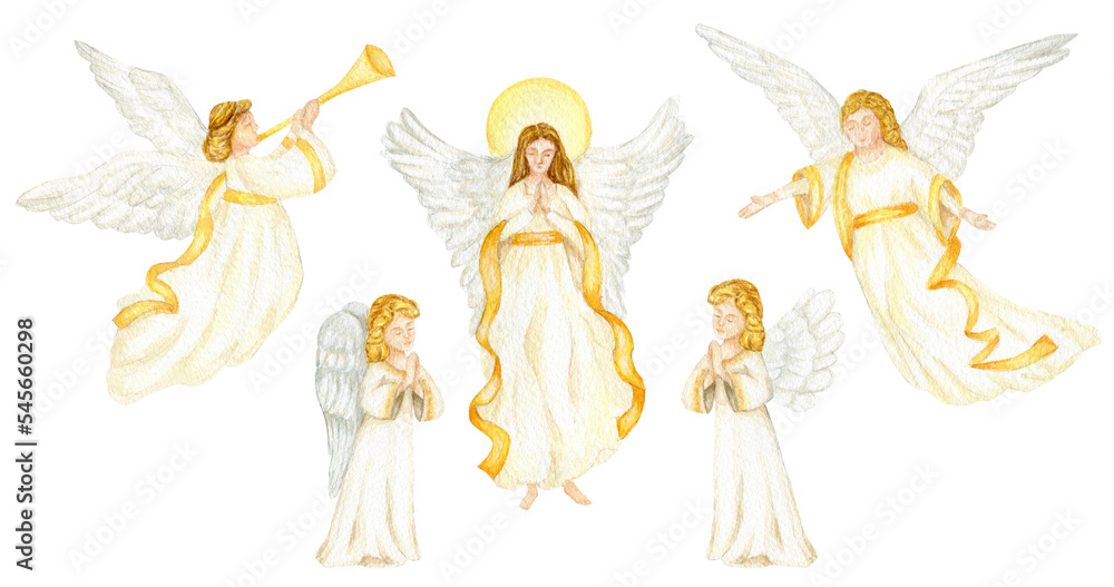 Fotografija Christmas angels set watercolor illustration, Christian Nativity angel with wing