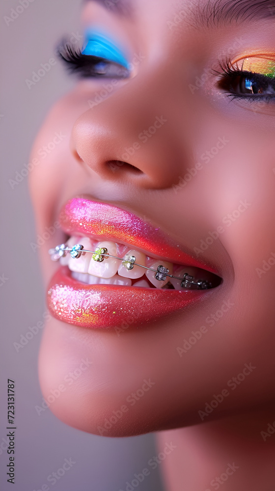 Fotografija Close-up of the smile of a young African American woman with bright makeup and ornate multi-colored shiny braces on healthy white teeth