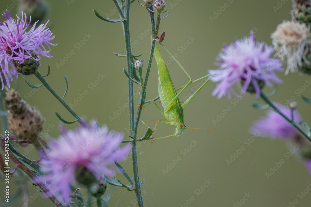 Slika na platnu Close-up of a sickle-bearing bush-cricket clinging to a spotted knapweed stem against a softly blurred light green background on a cloudy summer day