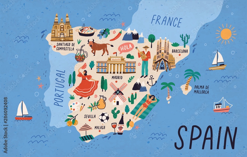 Slika na platnu Map of Spain with touristic landmarks or sights and national symbols - cathedrals, flamenco dancer, bull, sangria, paella, man playing guitar