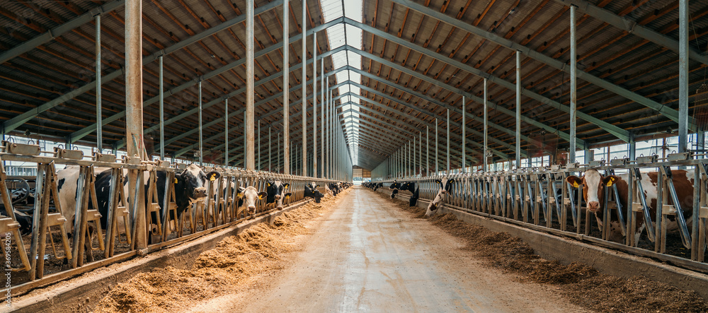 Slika na platnu Dairy farm, barn panorama with roof inside and many cows eating hay