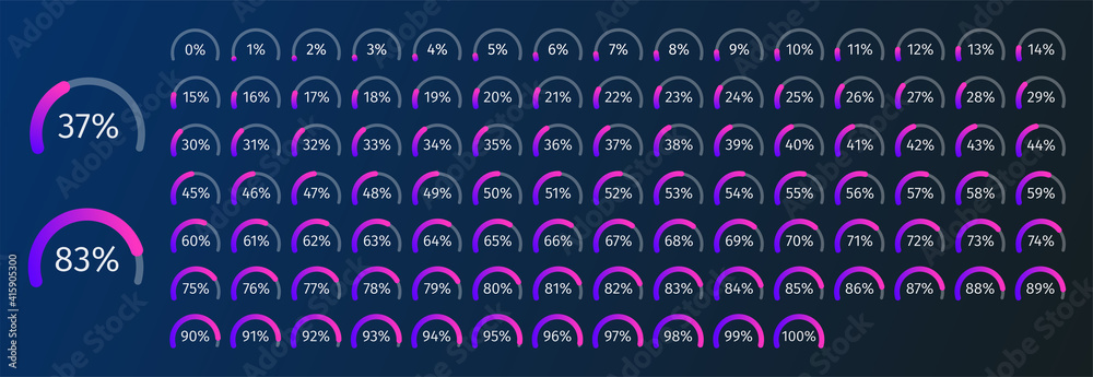 Slika na platnu Set of circle percentage diagrams from 0 to 100 for infographics with blue and purple colors on dark background