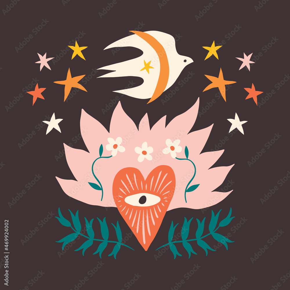 Slika na platnu Sacred heart flame love and peace concept boho naive funky handdrawn style art