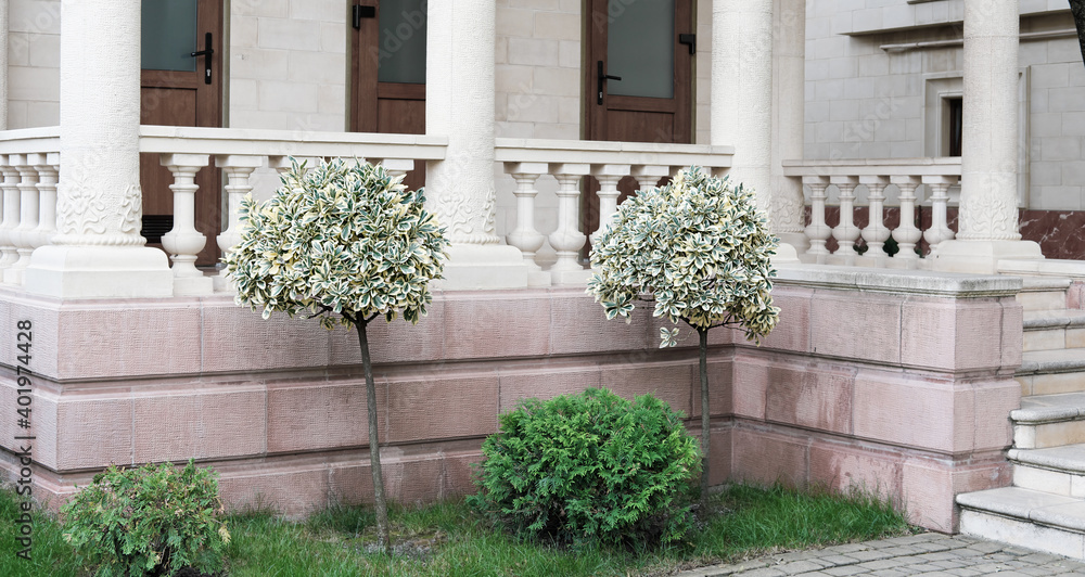 Fotografija variegated green and white foliage, bushes of Emerald Gaiety or Euonymus fortunei shrub planted in front of the classic style manison